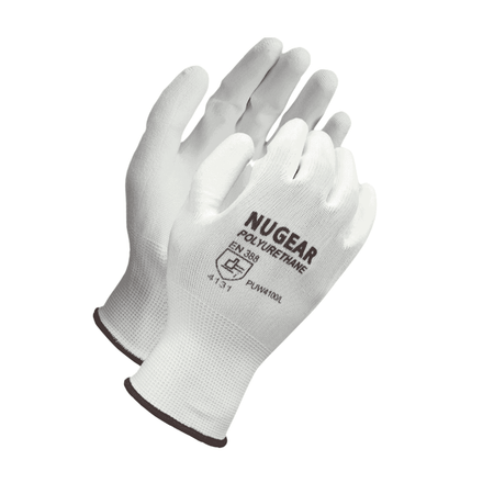 Enjoy superior grip and comfort with these white polyester gloves. The white polyurethane coating on the palms and fingers provides excellent abrasion resistance and durability. The seamless, 13-gauge polyester fiber knit shell adds extra flexibility, ensuring a comfortable fit. With an EN388 rating of 4131X, these gloves are great for light industrial work, warehousing, and packaging. Don't sacrifice performance for comfort; choose these gloves for optimal protection and tactile sensitivity. Available in multiple sizes to fit your needs.