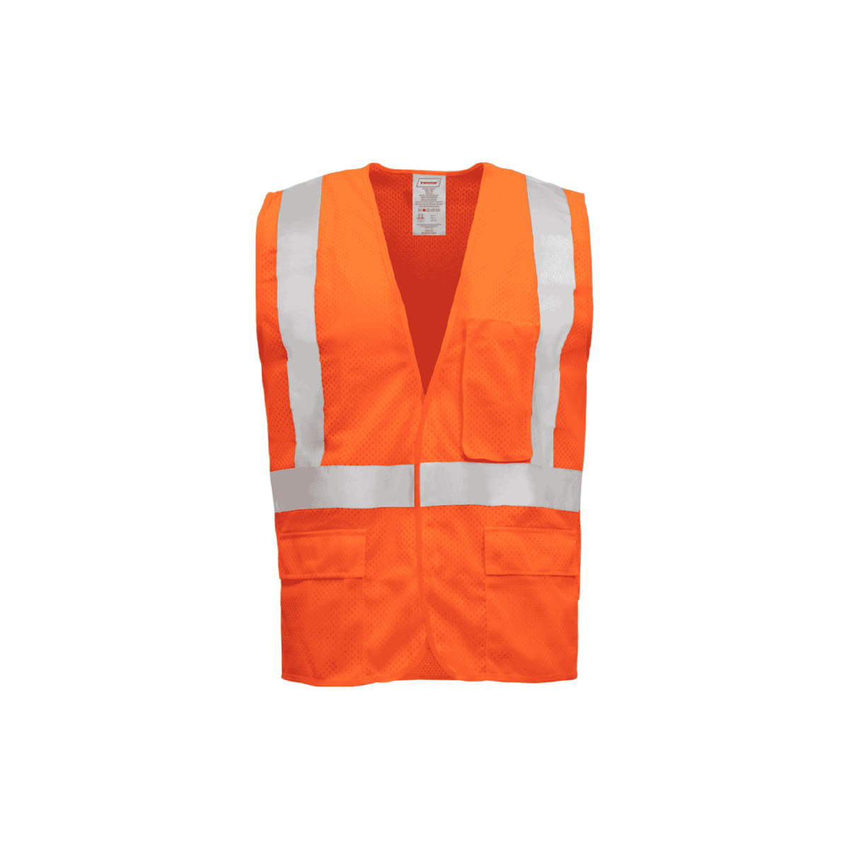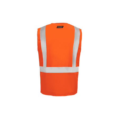 This high-visibility safety vest is constructed from 100% polyester mesh fabric, offering lightweight breathability and durability for long-lasting comfort. Designed to meet ANSI/ISEA 107-2015 Class 2 standards, it features 2-inch silver reflective tape placed over the shoulders and around the torso to ensure maximum visibility in hazardous work environments. The hook & loop front closure allows for easy and secure wear. For added functionality, it includes five pockets—one upper left chest pocket, two exterior waist pockets with flaps, and two interior waist pockets—providing ample storage for essential tools and accessories. This vest is an ideal choice for professionals needing enhanced visibility and convenience.