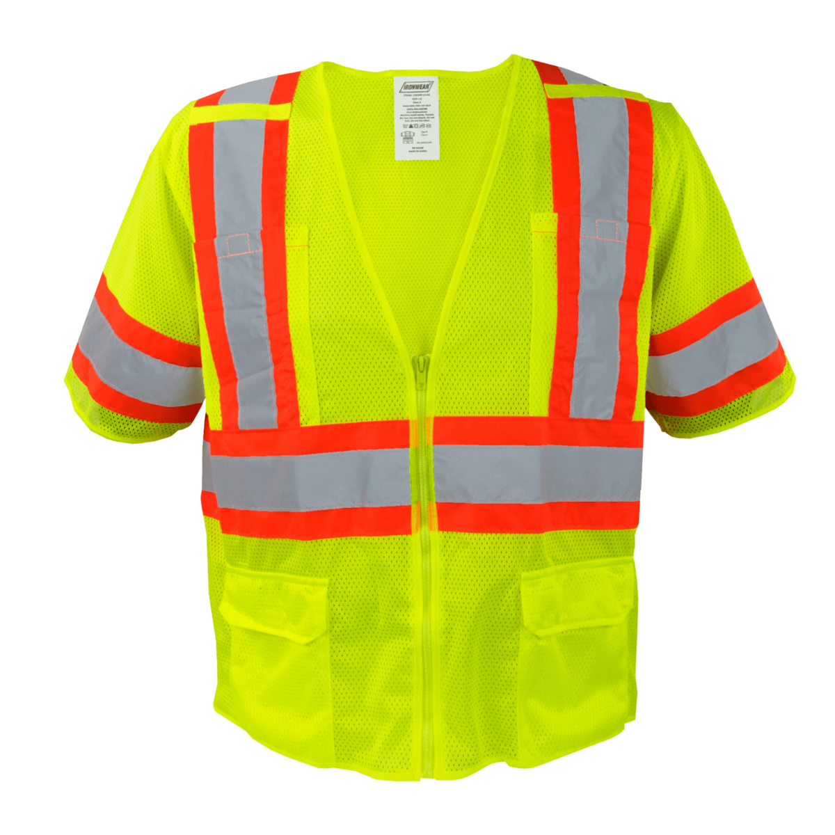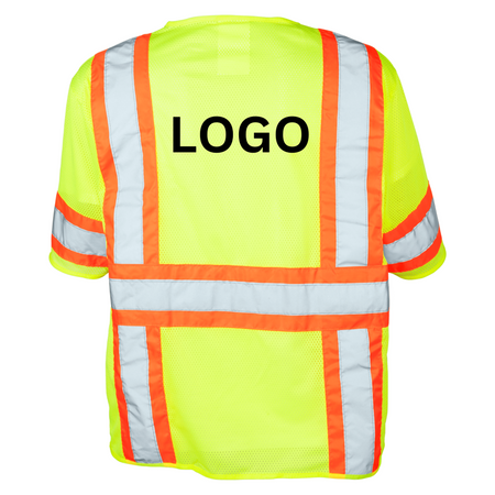 This 100% polyester mesh safety vest is designed for high visibility and enhanced functionality in hazardous work environments. Constructed in hi-vis lime with hi-vis lime polyester binding, the vest is lightweight and breathable for all-day comfort. It features 2-inch silver reflective tape over 4-inch hi-vis orange fabric, extending over the shoulders, around the torso, and forming an H-pattern across the back, ensuring maximum visibility in low-light conditions.