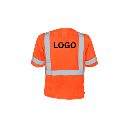 High-visibility Class 3 safety vest made from breathable orange polyester mesh fabric with matching orange binding. Features 2” silver reflective tape in a suspender pattern over the shoulders and 360° continuous reflective bands for maximum visibility. Designed with a secure front hook & loop closure and five functional pockets for storage.