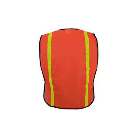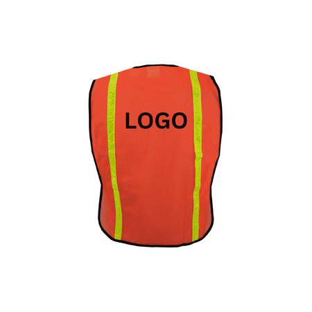 This high-visibility safety vest is made from orange polyester mesh fabric with black polyester binding for durability and contrast. It features 1” reflective lime tape to enhance visibility in various lighting conditions. The hook & loop front closure ensures quick and secure fastening. Designed for affordability and functionality, this economy-class vest is ideal for a range of work environments.