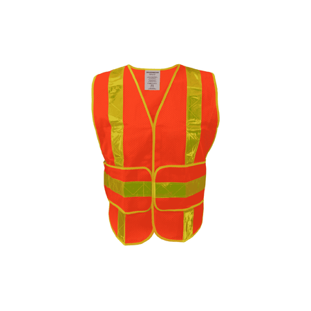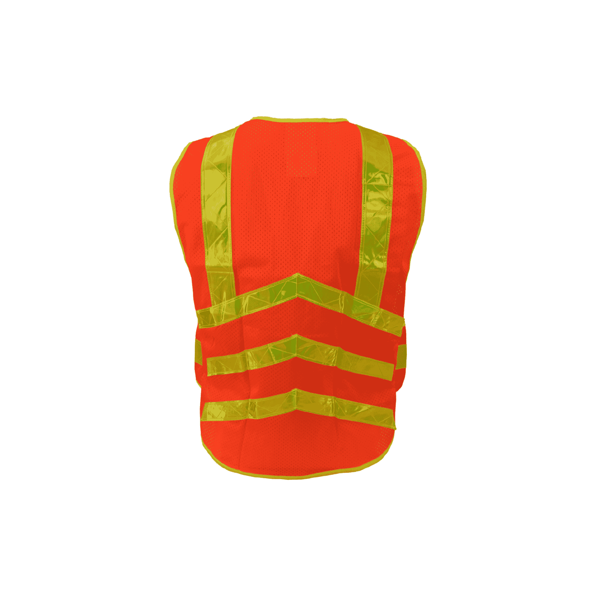 This high-visibility safety vest is made from orange polyester mesh fabric with lime polyester binding for durability. It features 2” lime reflective striping with a 1-3/8” chevron pattern on the back for enhanced visibility. Designed for convenience, it includes an adjustable hook & loop front and side closure. This economy-class vest provides essential safety at an affordable price.