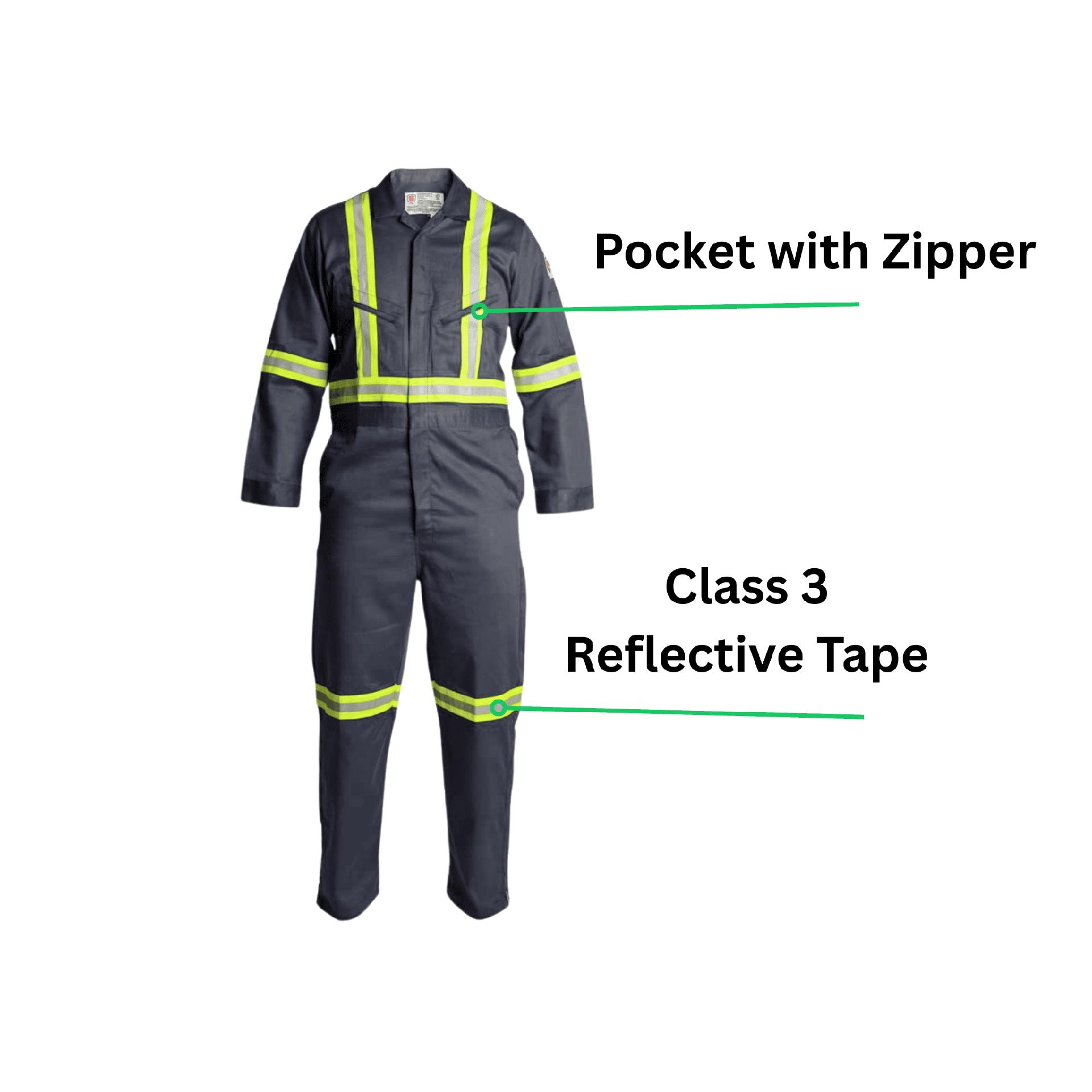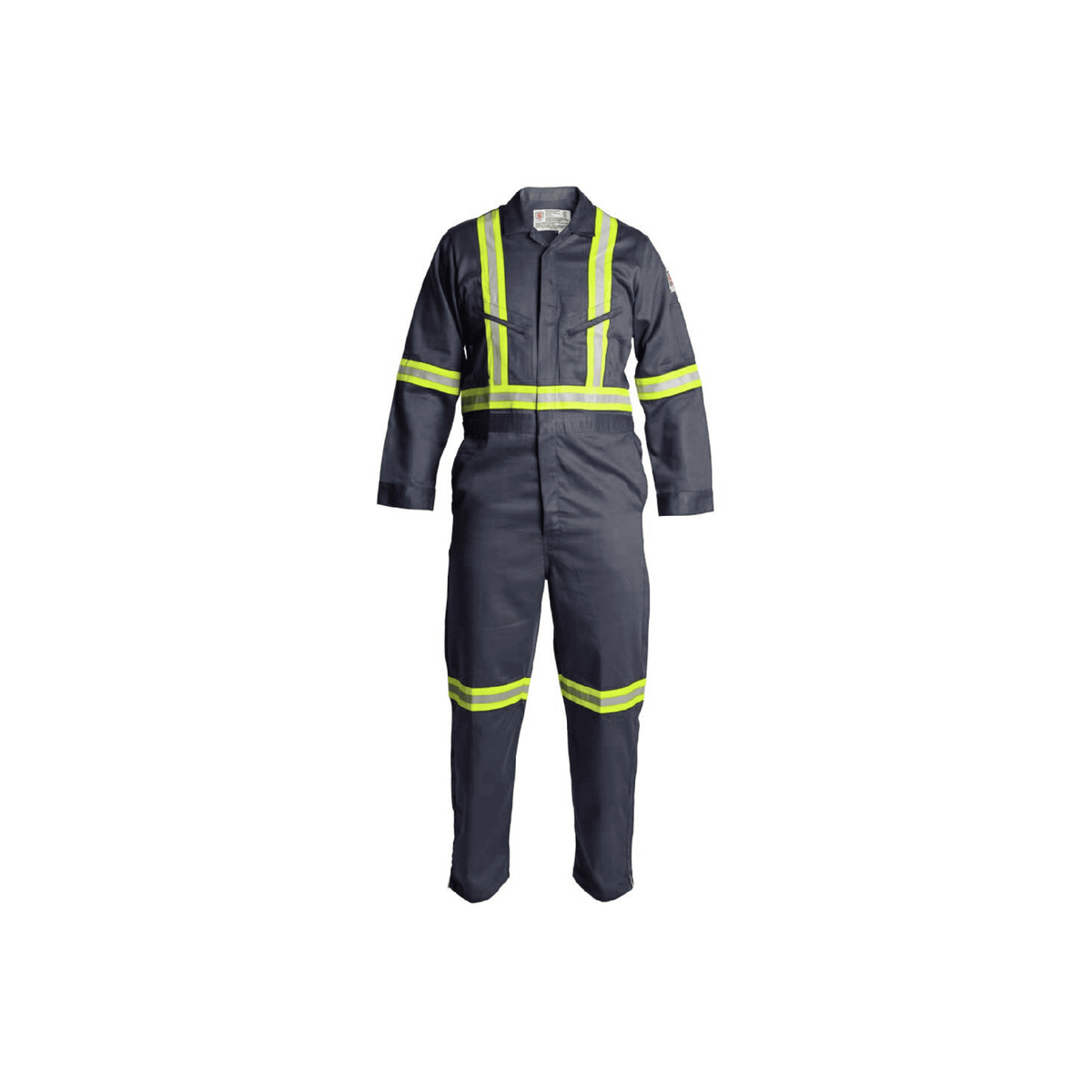 Additionally, these gray FR coveralls feature 2" lime/silver reflective tape configured in an X-back pattern for ANSI Class 3 high visibility, improving safety in low-light conditions. Furthermore, the design includes zipper leg openings for quick wear, a slanted zip chest pocket for secure storage, and a comfortable fit that supports freedom of movement during demanding tasks.