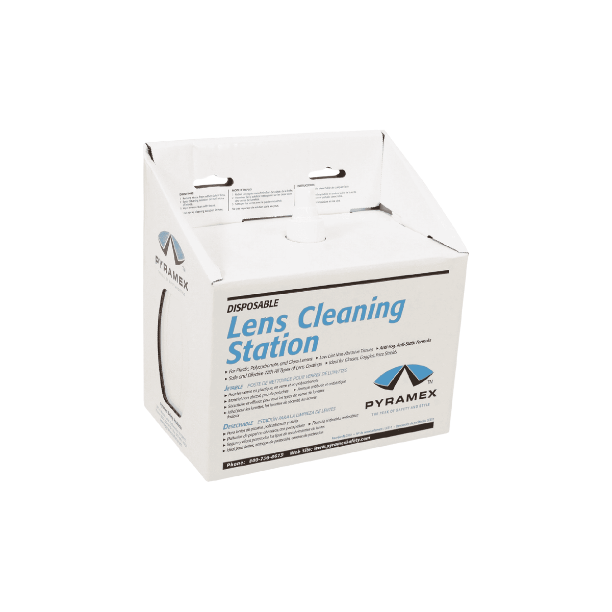 Lens cleaning station with 8 oz. or 16 oz. cleaning solution.