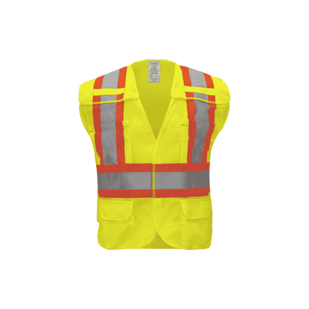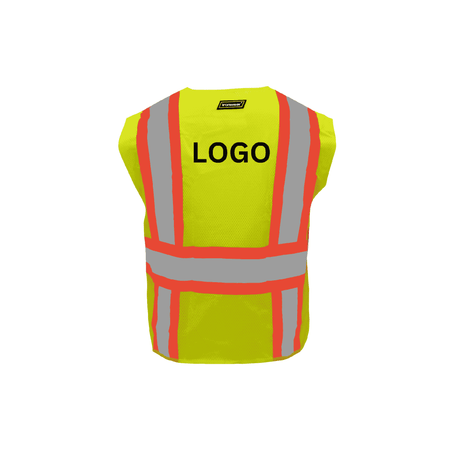 This high-visibility safety vest is designed for maximum visibility and practical functionality. It features 2-inch silver reflective tape on 4-inch orange fabric, arranged in a suspender pattern over the shoulders, with 360° continuous reflective bands encircling the torso for all-around visibility. Equipped with two radio clip holders, it provides easy access to communication devices. Made from 100% polyester mesh fabric with lime polyester binding, this Class 2 vest meets ANSI/ISEA 107-2015 safety standards. It is designed with a front hook & loop closure and full breakaway functionality on the shoulders and sides for added safety. The vest also offers six strategically placed pockets, including two front lower flap pockets, two chest pockets, and two inside upper pockets for convenient storage.