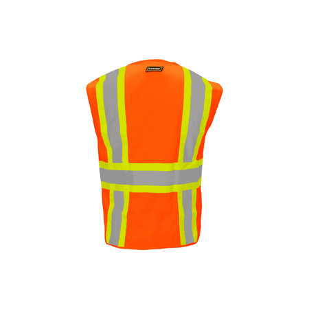 This safety vest is constructed from 100% polyester mesh fabric for exceptional breathability and durability. It features a dynamic design with 2-inch silver reflective tape applied over contrasting fabric that extends over the shoulders, around the torso, and in an H-pattern across the back, ensuring enhanced visibility from all angles. The vest is accented with hi-vis orange polyester binding and is designed in a striking hi-vis orange color. Certified under ANSI/ISEA 107 as a Type R, Class 2 garment, it secures with a convenient zipper front closure. Additionally, the vest incorporates 6 strategically placed pockets—comprising 2 chest pockets, 2 waist pockets, and 2 inside pockets—for versatile storage options.