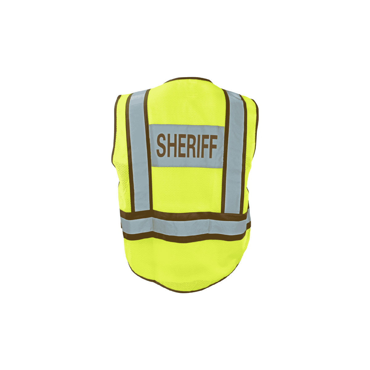 The Public Safety SHERIFF Vest is designed for professionals working in potentially hazardous environments, ensuring maximum visibility, adjustability, and safety. Made from 100% polyester fabric in hi-vis lime with brown polyester binding, this vest offers durability and breathability while maintaining high visibility in low-light conditions.