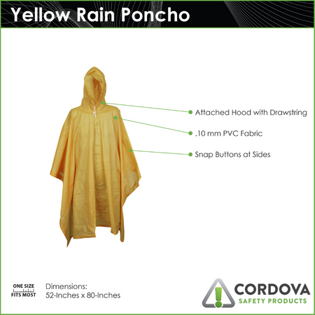 Cordova Safety Products offers an economical and dependable solution for rain protection with this high-quality rain poncho. Crafted from durable .10 mm single-ply PVC fabric, the poncho ensures reliable coverage against rain while remaining lightweight and comfortable. It features an attached hood with a drawstring for a secure fit and snap buttons on the sides for added convenience. The poncho’s generous dimensions provide ample coverage, and it is available in multiple colors to suit different preferences. Designed to fit most sizes comfortably, this rain poncho is an essential accessory for staying dry in inclement weather.