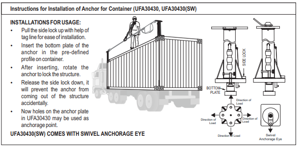 | Design | Provides temporary anchor for 20 ft. – 40 ft. shipping containers. Can be used as a stand-alone anchor or to form a horizontal lifeline. Side lock and tagline for easy, secure installation by one person. Allows 360° rotation with an anchorage eye diameter of 0.78” (20mm), suitable for most connectors. Side handle with special grip for easy carrying and transportation. Easily removable without damaging the container |